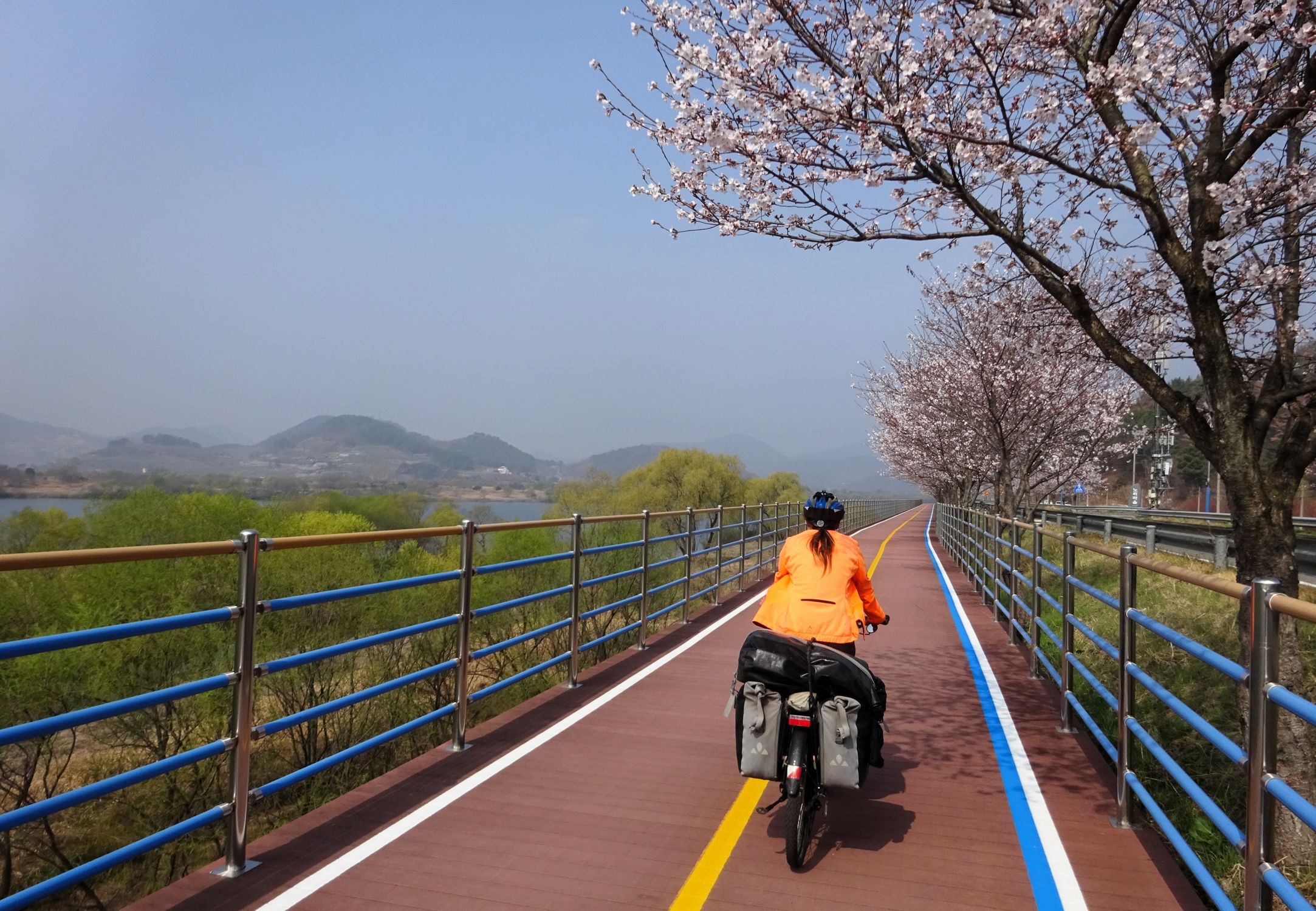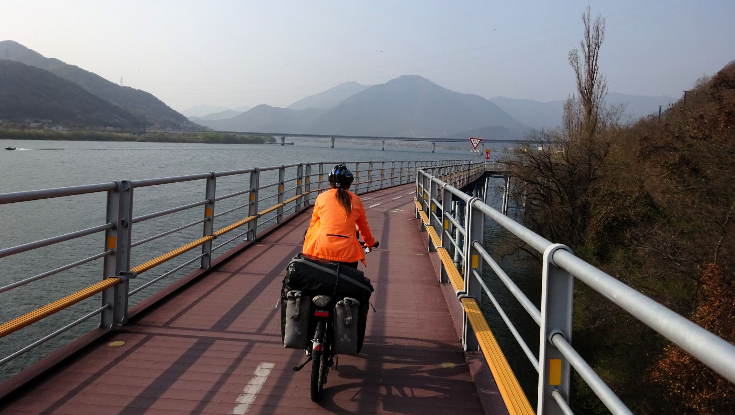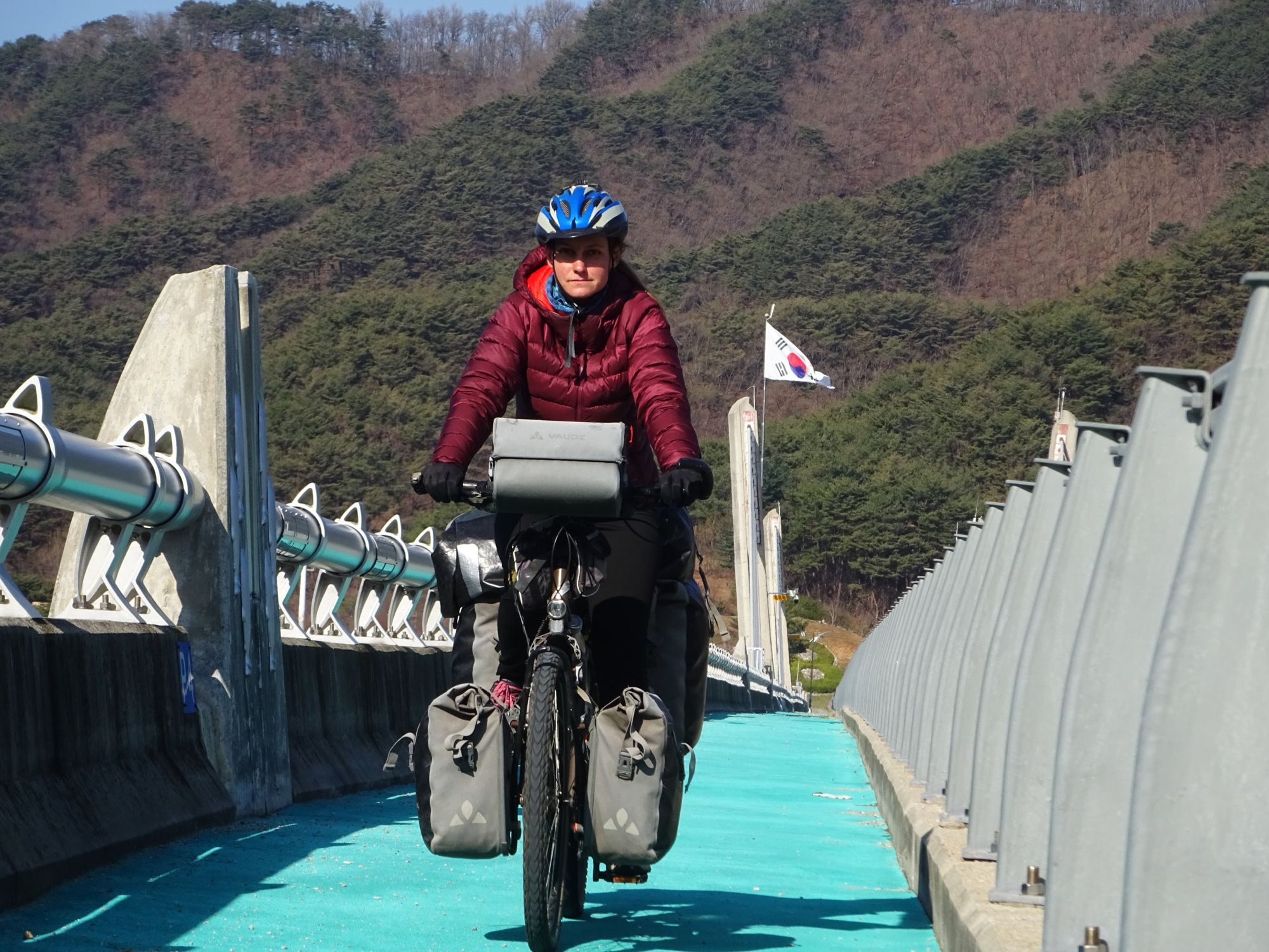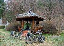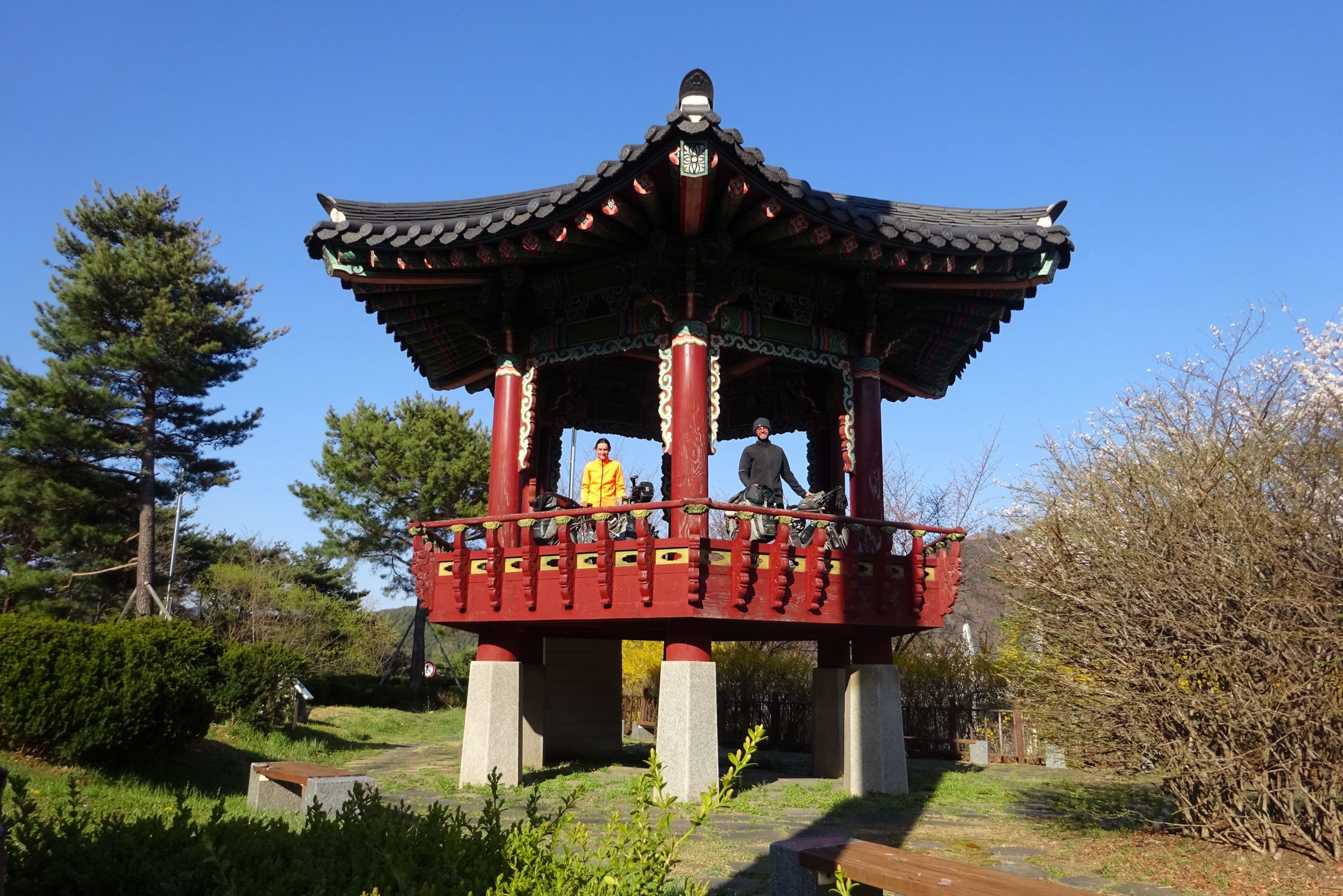 Mit der Fähre setzen wir von Japan in die Hafenstadt Busan im Südosten Südkoreas über. Damit kehren wir nach 9 Monaten wieder zurück aufs Asiatische Festland und fahren gleichzeitig nach über einem Jahr im Linksverkehr wieder auf der rechten Straßenseite. Wenn wir denn überhaupt mal auf Straßen fahren – denn Südkorea ist unter Radfahrern berühmt für sein gut ausgebautes Netz an Flussradwegen, das für ein asiatisches Land absolut einzigartig ist. Sogar weltweit einzigartig ist das Stempelsystem, in dem man spielerisch motiviert wird, auch wirklich möglichst viele der Radwege, die das Land zu bieten hat, abzufahren. Das macht Südkorea zum perfekten Transitland, denn auf den Flussradwegen lässt sich das Land ausgesprochen effizient und komfortabel durchqueren, wobei wir aber gleichzeitig am Wegesrand wenig Interessantes entdecken, was Südkorea als eigentliches Reiseziel lohnenswert machen würde. Und sobald wir das Radwegenetz mal verlassen, haben wir mit ziemlich unangenehmen Tunneln zu kämpfen, wodurch schließlich auch die Polizei auf uns aufmerksam wird. Und so sind die südkoreanischen Höhepunkte für uns zum einen die hübschen Pavillons, die absolut perfekte Zeltplätze sind, und zum anderen das ausgesprochen nette Zusammentreffen mit den Radreise-Kollegen Dai sowie Kyra & Michael.