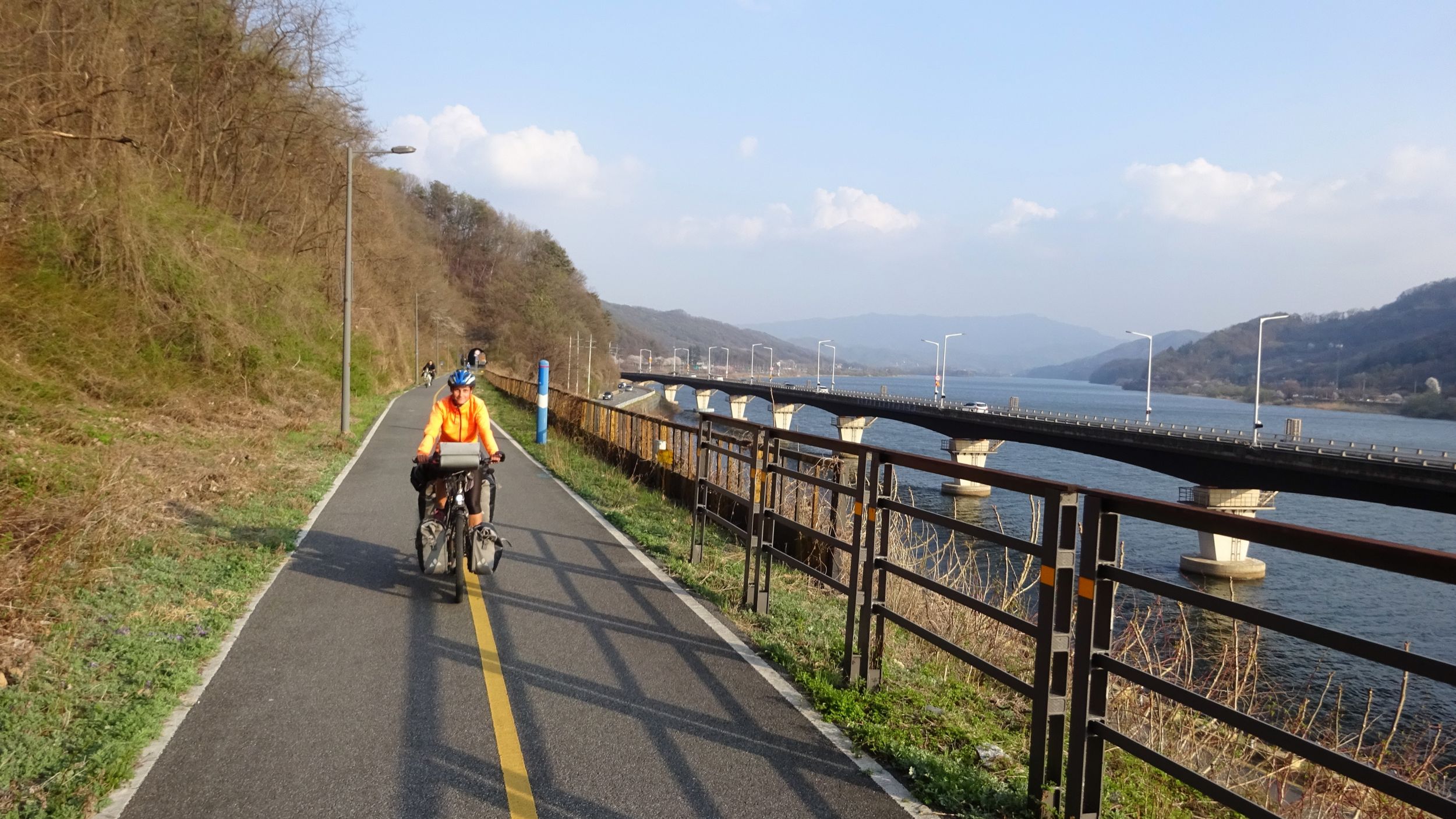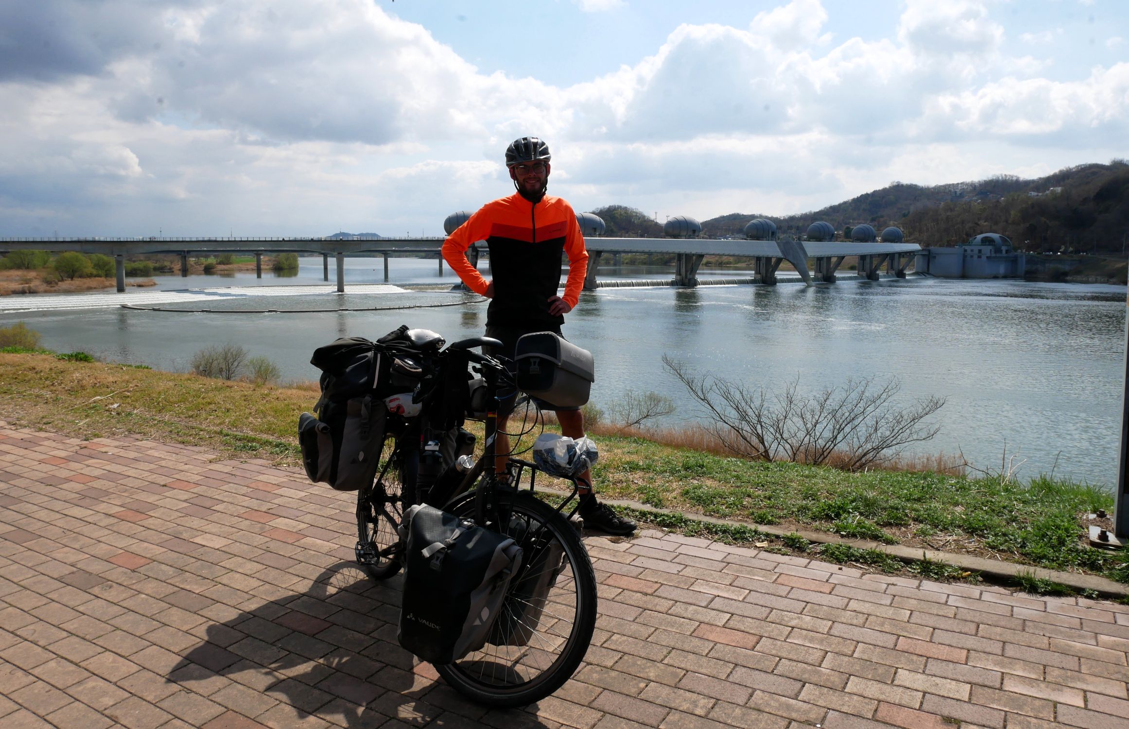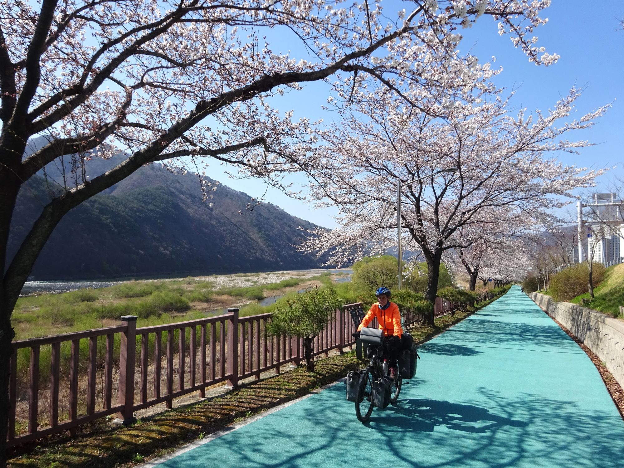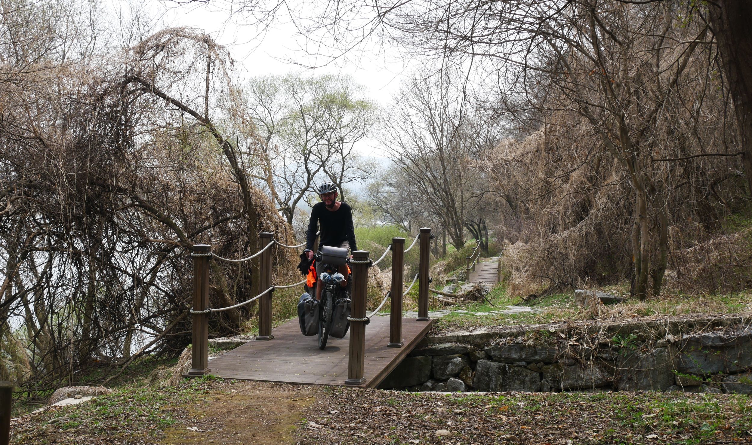 Mit der Fähre setzen wir von Japan in die Hafenstadt Busan im Südosten Südkoreas über. Damit kehren wir nach 9 Monaten wieder zurück aufs Asiatische Festland und fahren gleichzeitig nach über einem Jahr im Linksverkehr wieder auf der rechten Straßenseite. Wenn wir denn überhaupt mal auf Straßen fahren – denn Südkorea ist unter Radfahrern berühmt für sein gut ausgebautes Netz an Flussradwegen, das für ein asiatisches Land absolut einzigartig ist. Sogar weltweit einzigartig ist das Stempelsystem, in dem man spielerisch motiviert wird, auch wirklich möglichst viele der Radwege, die das Land zu bieten hat, abzufahren. Das macht Südkorea zum perfekten Transitland, denn auf den Flussradwegen lässt sich das Land ausgesprochen effizient und komfortabel durchqueren, wobei wir aber gleichzeitig am Wegesrand wenig Interessantes entdecken, was Südkorea als eigentliches Reiseziel lohnenswert machen würde. Und sobald wir das Radwegenetz mal verlassen, haben wir mit ziemlich unangenehmen Tunneln zu kämpfen, wodurch schließlich auch die Polizei auf uns aufmerksam wird. Und so sind die südkoreanischen Höhepunkte für uns zum einen die hübschen Pavillons, die absolut perfekte Zeltplätze sind, und zum anderen das ausgesprochen nette Zusammentreffen mit den Radreise-Kollegen Dai sowie Kyra & Michael.