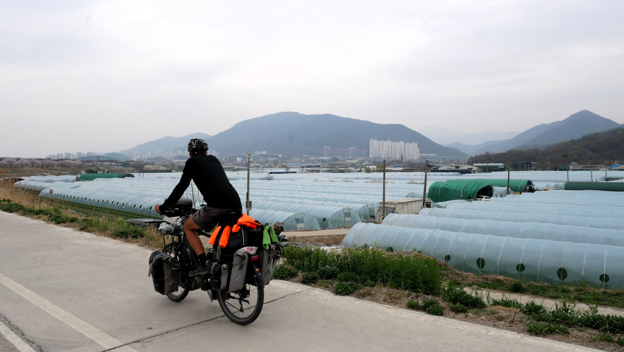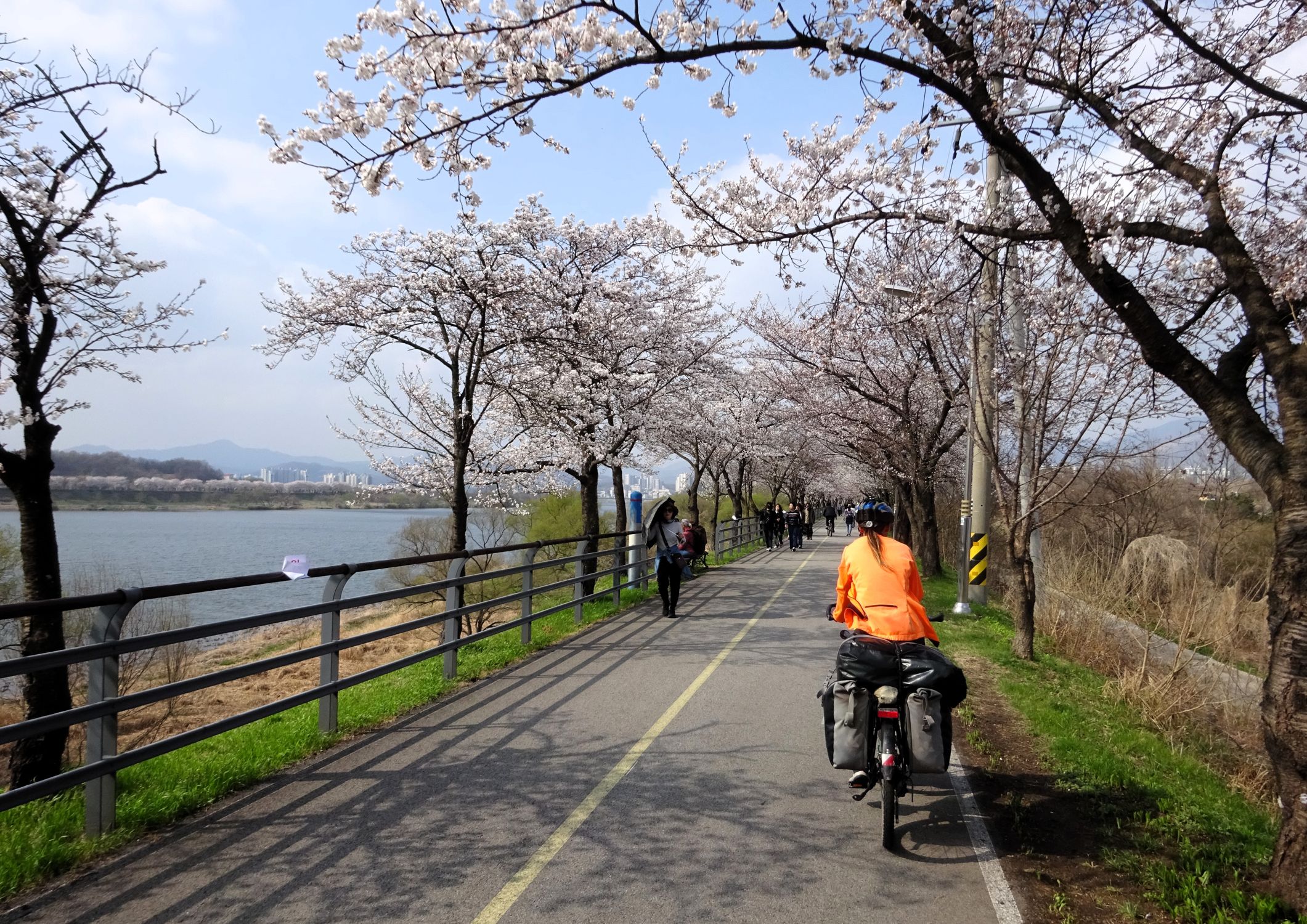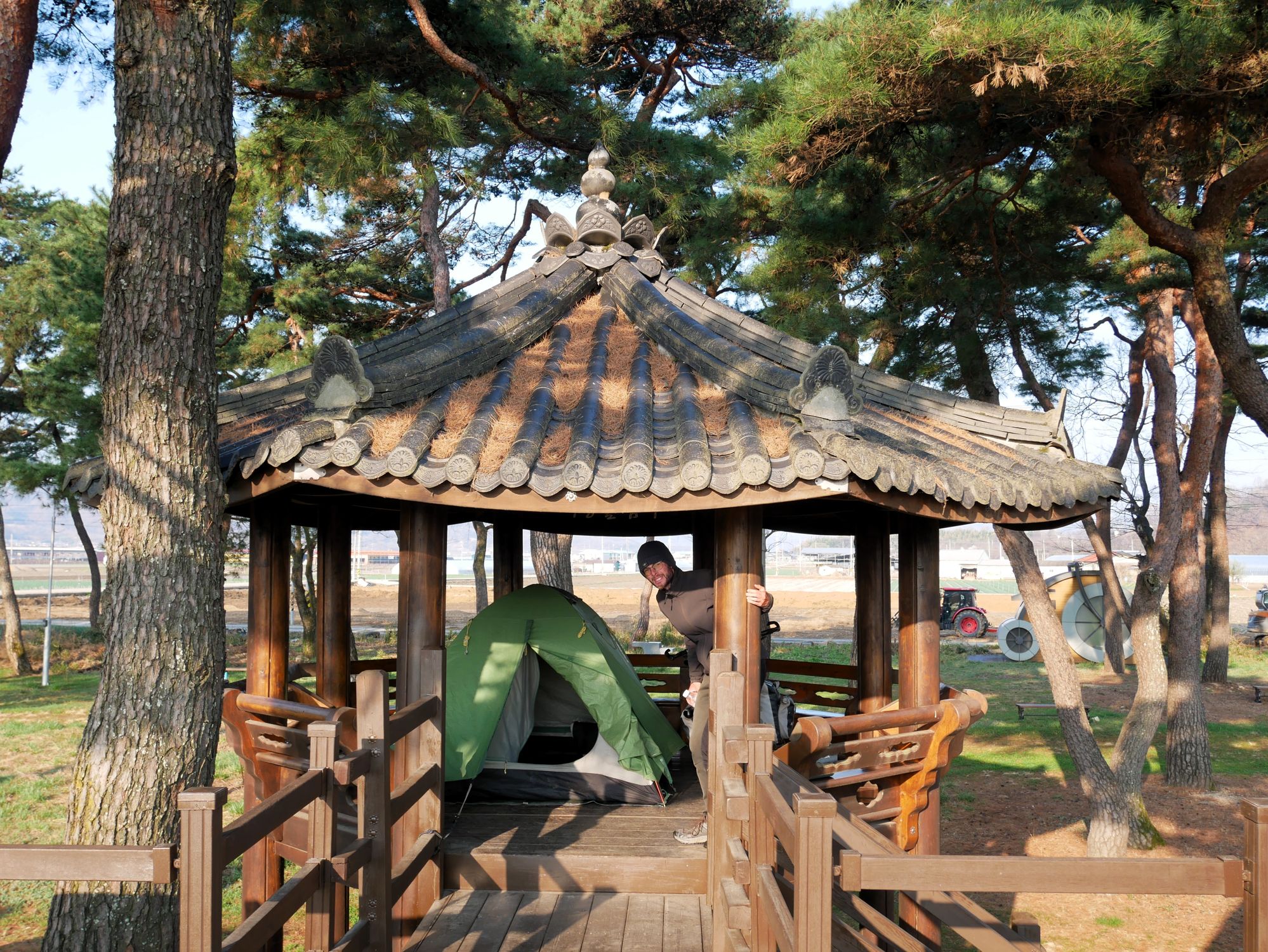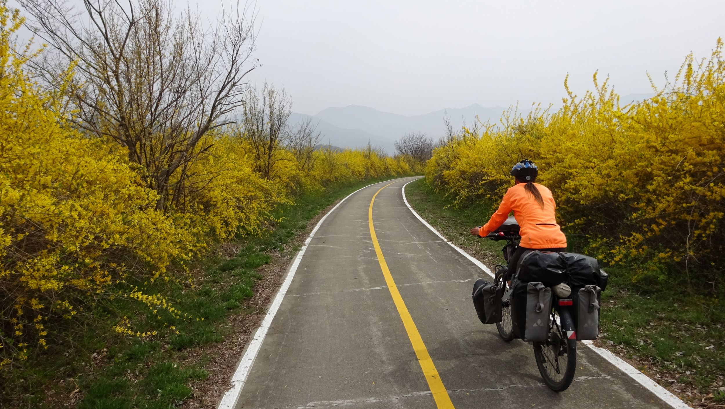 Mit der Fähre setzen wir von Japan in die Hafenstadt Busan im Südosten Südkoreas über. Damit kehren wir nach 9 Monaten wieder zurück aufs Asiatische Festland und fahren gleichzeitig nach über einem Jahr im Linksverkehr wieder auf der rechten Straßenseite. Wenn wir denn überhaupt mal auf Straßen fahren – denn Südkorea ist unter Radfahrern berühmt für sein gut ausgebautes Netz an Flussradwegen, das für ein asiatisches Land absolut einzigartig ist. Sogar weltweit einzigartig ist das Stempelsystem, in dem man spielerisch motiviert wird, auch wirklich möglichst viele der Radwege, die das Land zu bieten hat, abzufahren. Das macht Südkorea zum perfekten Transitland, denn auf den Flussradwegen lässt sich das Land ausgesprochen effizient und komfortabel durchqueren, wobei wir aber gleichzeitig am Wegesrand wenig Interessantes entdecken, was Südkorea als eigentliches Reiseziel lohnenswert machen würde. Und sobald wir das Radwegenetz mal verlassen, haben wir mit ziemlich unangenehmen Tunneln zu kämpfen, wodurch schließlich auch die Polizei auf uns aufmerksam wird. Und so sind die südkoreanischen Höhepunkte für uns zum einen die hübschen Pavillons, die absolut perfekte Zeltplätze sind, und zum anderen das ausgesprochen nette Zusammentreffen mit den Radreise-Kollegen Dai sowie Kyra & Michael.