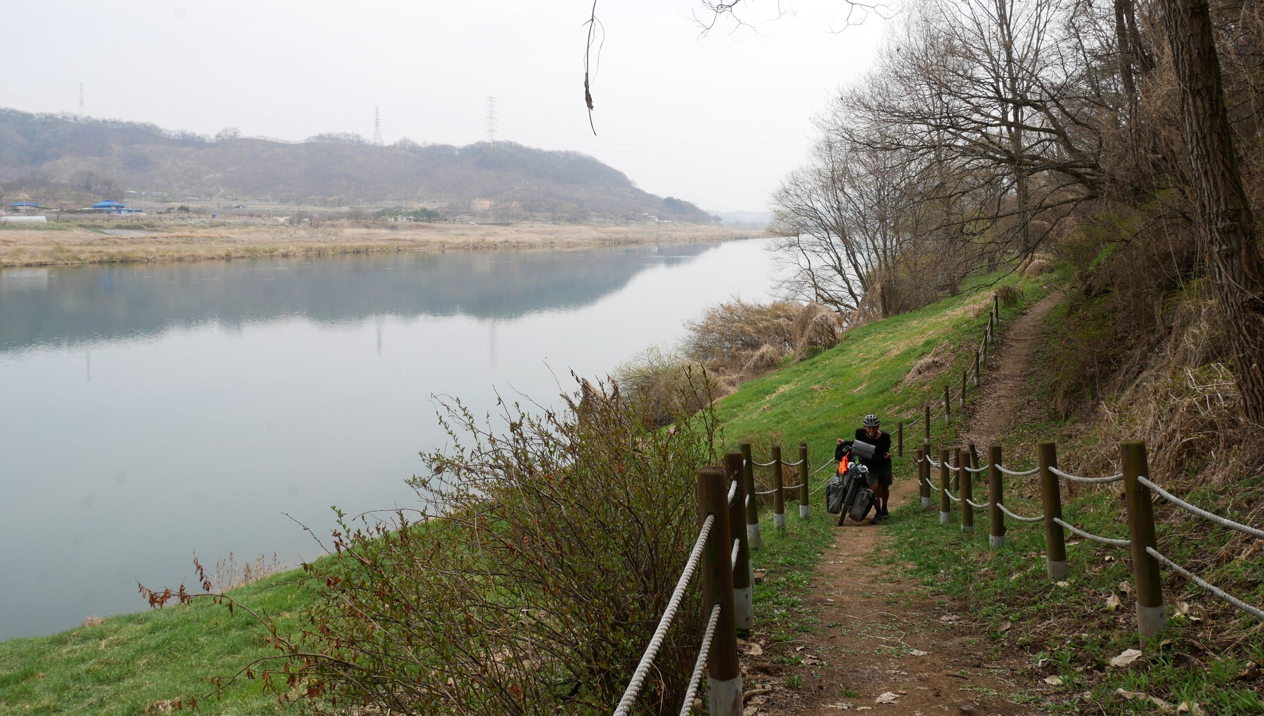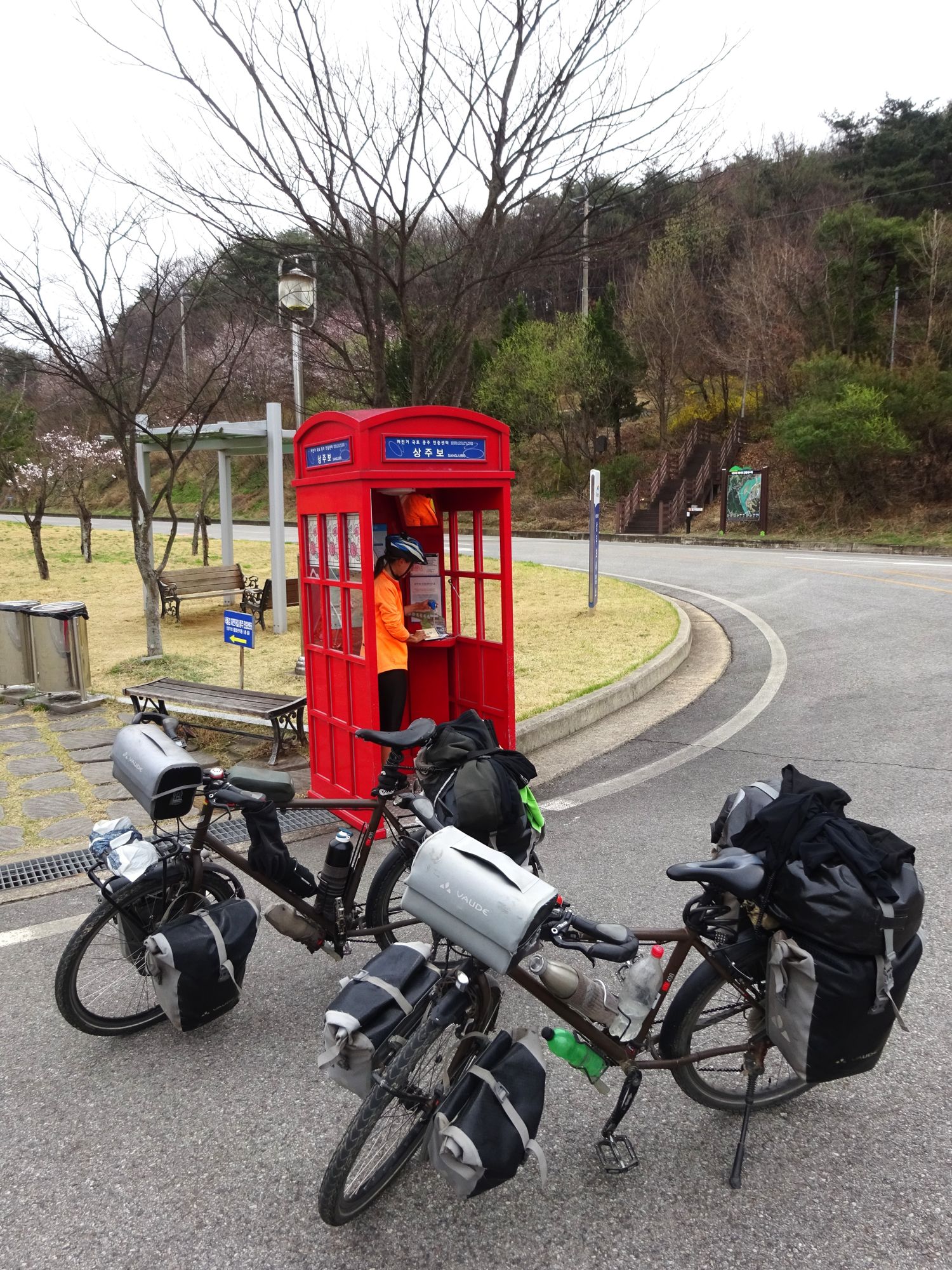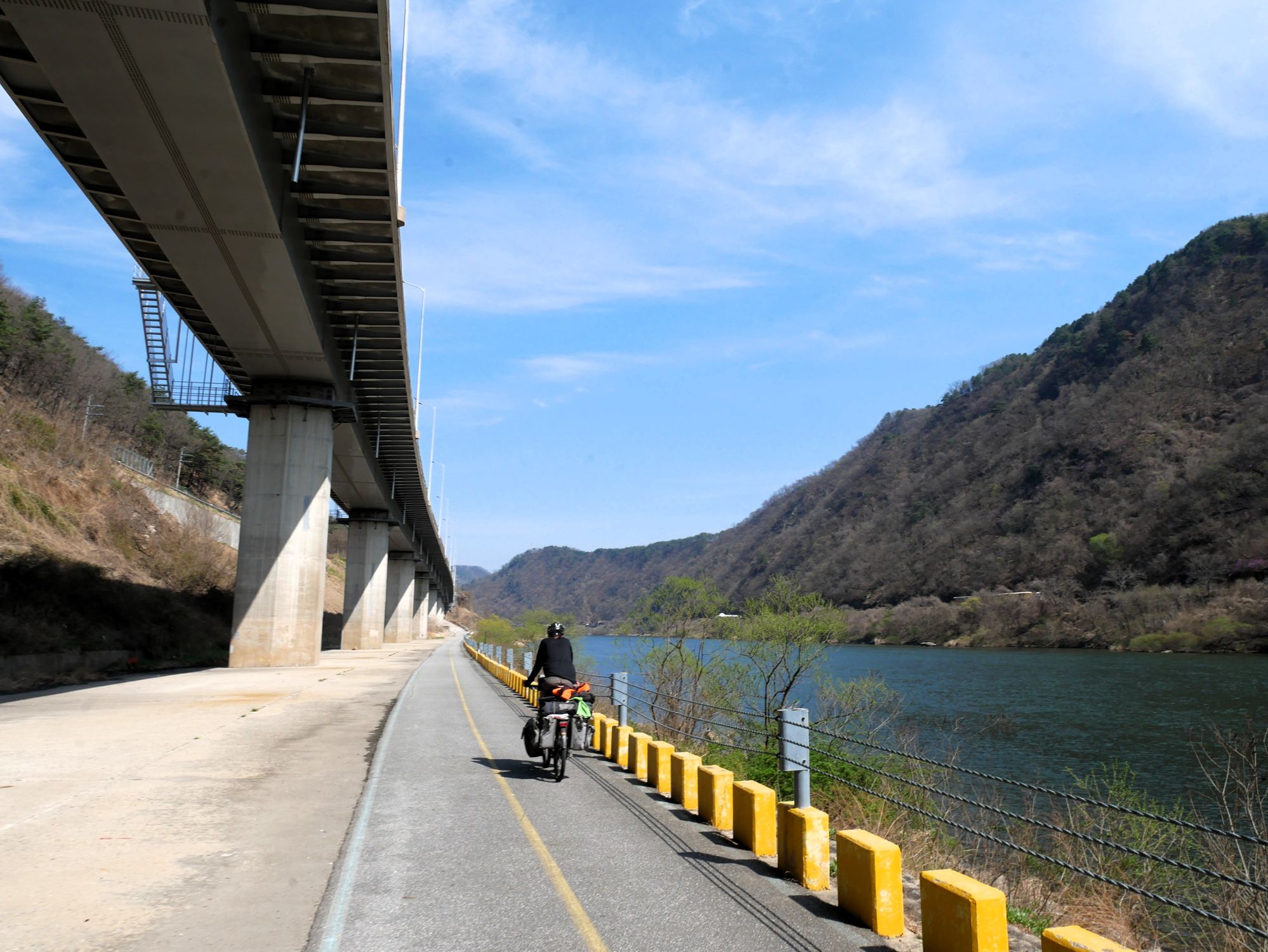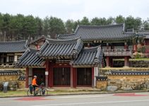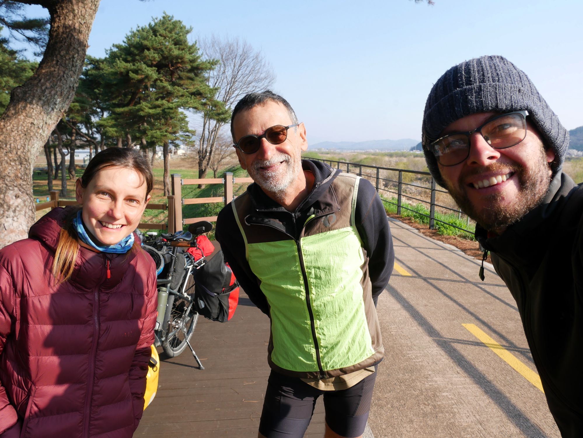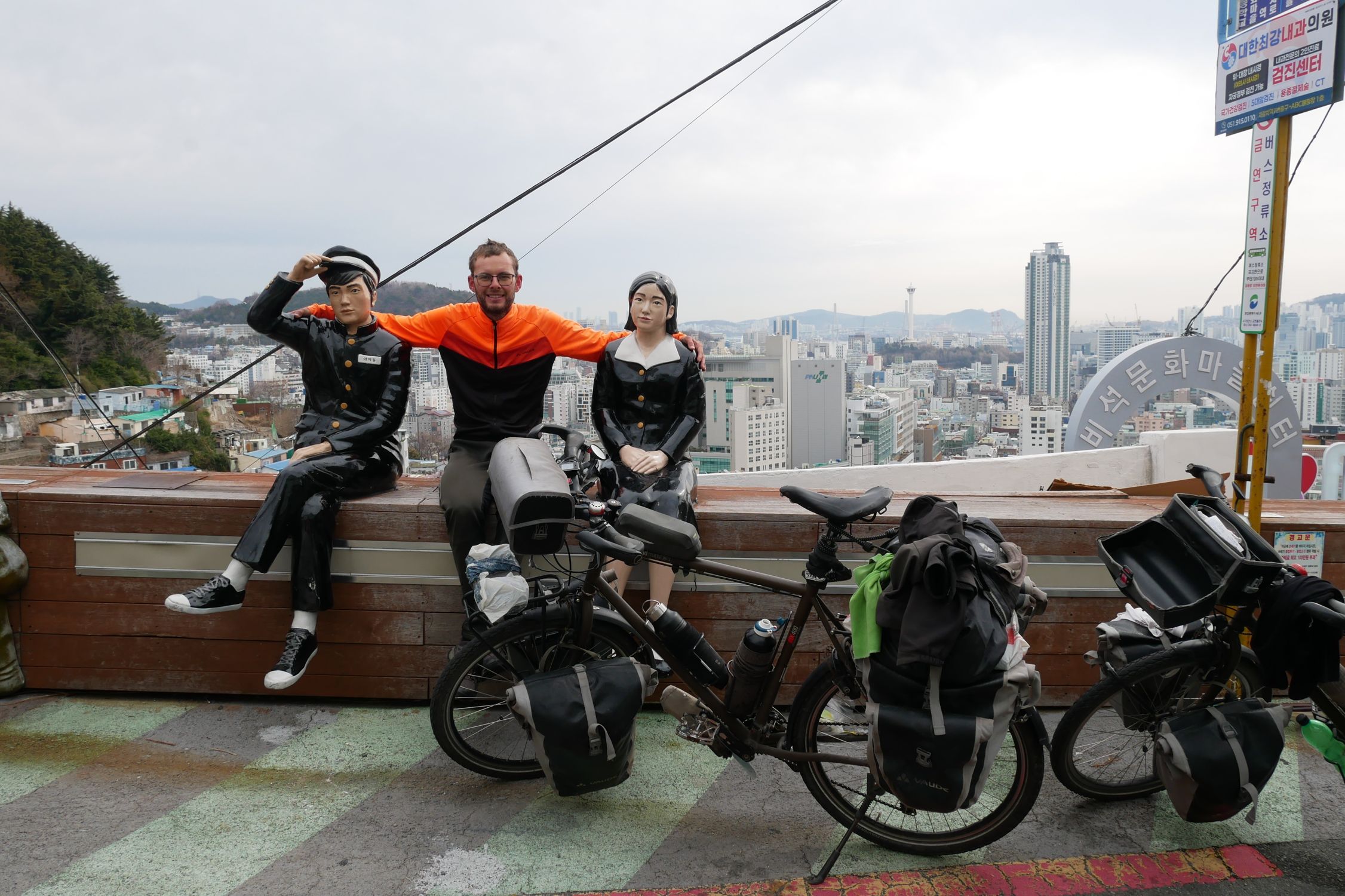 Mit der Fähre setzen wir von Japan in die Hafenstadt Busan im Südosten Südkoreas über. Damit kehren wir nach 9 Monaten wieder zurück aufs Asiatische Festland und fahren gleichzeitig nach über einem Jahr im Linksverkehr wieder auf der rechten Straßenseite. Wenn wir denn überhaupt mal auf Straßen fahren – denn Südkorea ist unter Radfahrern berühmt für sein gut ausgebautes Netz an Flussradwegen, das für ein asiatisches Land absolut einzigartig ist. Sogar weltweit einzigartig ist das Stempelsystem, in dem man spielerisch motiviert wird, auch wirklich möglichst viele der Radwege, die das Land zu bieten hat, abzufahren. Das macht Südkorea zum perfekten Transitland, denn auf den Flussradwegen lässt sich das Land ausgesprochen effizient und komfortabel durchqueren, wobei wir aber gleichzeitig am Wegesrand wenig Interessantes entdecken, was Südkorea als eigentliches Reiseziel lohnenswert machen würde. Und sobald wir das Radwegenetz mal verlassen, haben wir mit ziemlich unangenehmen Tunneln zu kämpfen, wodurch schließlich auch die Polizei auf uns aufmerksam wird. Und so sind die südkoreanischen Höhepunkte für uns zum einen die hübschen Pavillons, die absolut perfekte Zeltplätze sind, und zum anderen das ausgesprochen nette Zusammentreffen mit den Radreise-Kollegen Dai sowie Kyra & Michael.