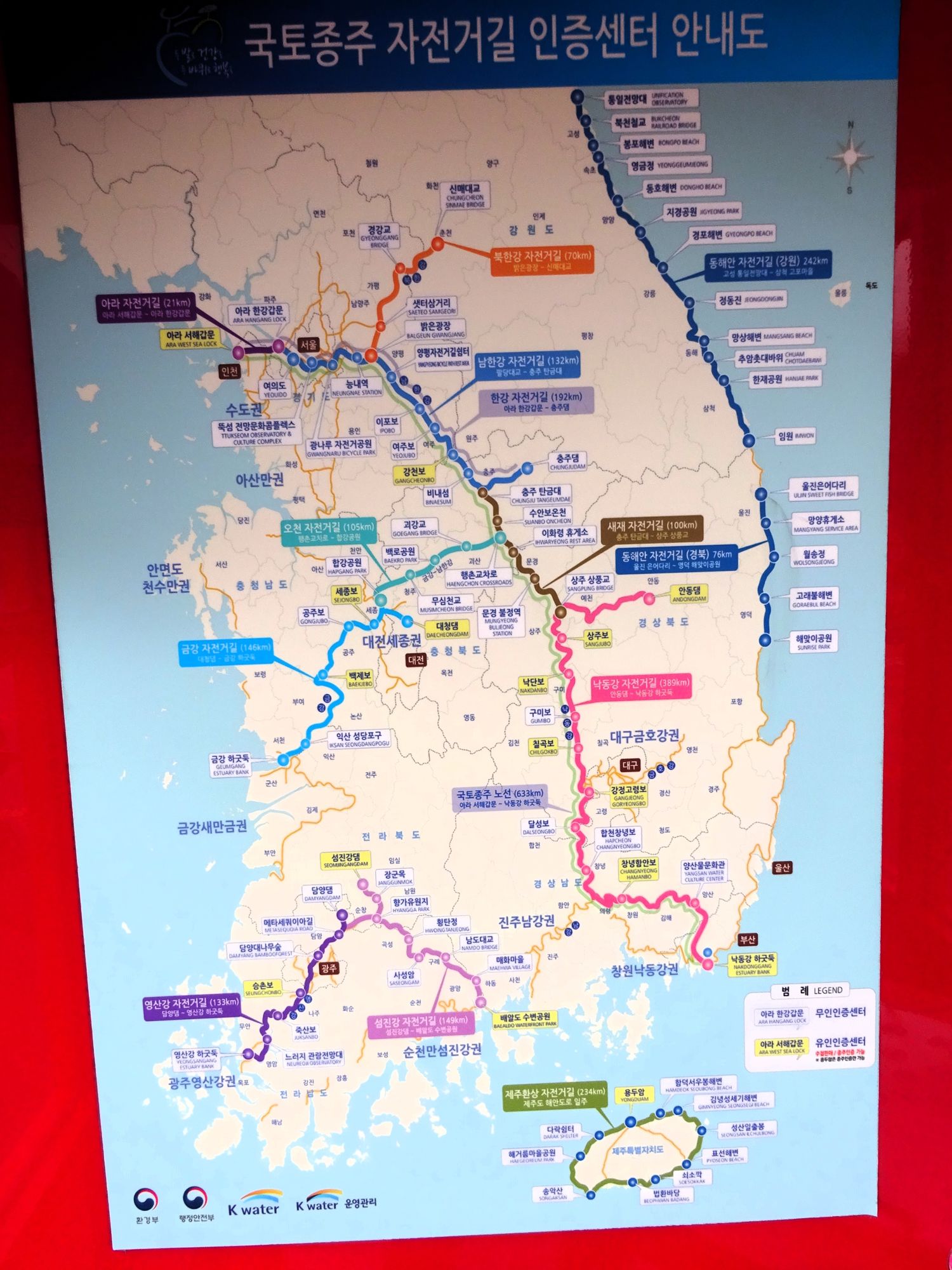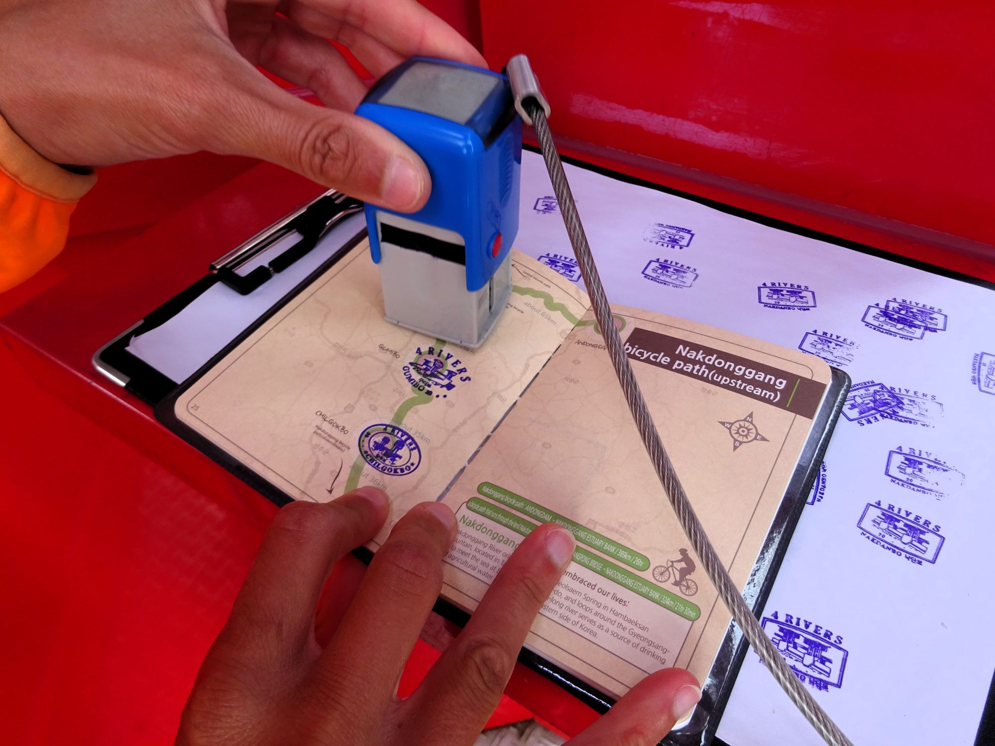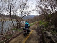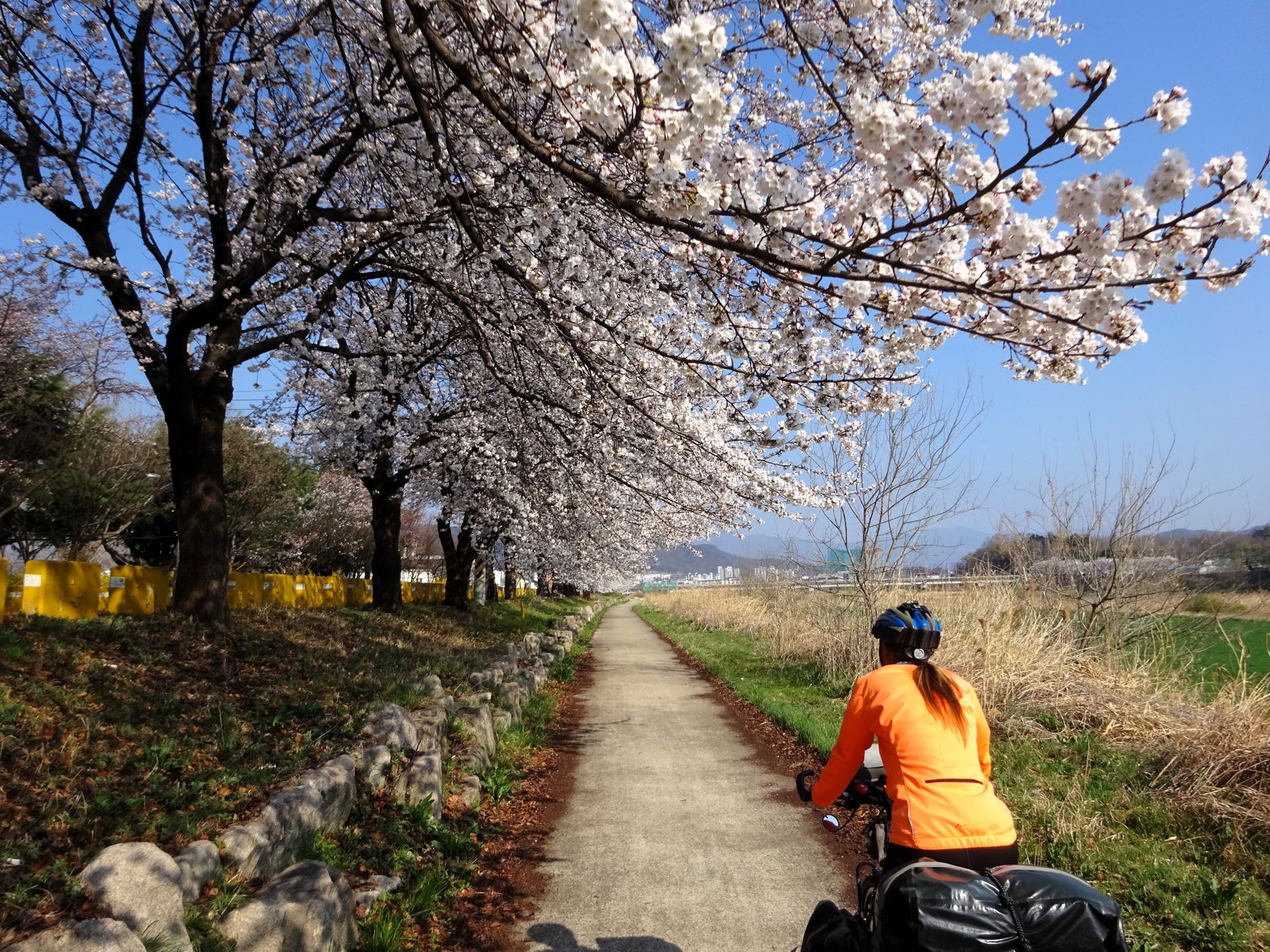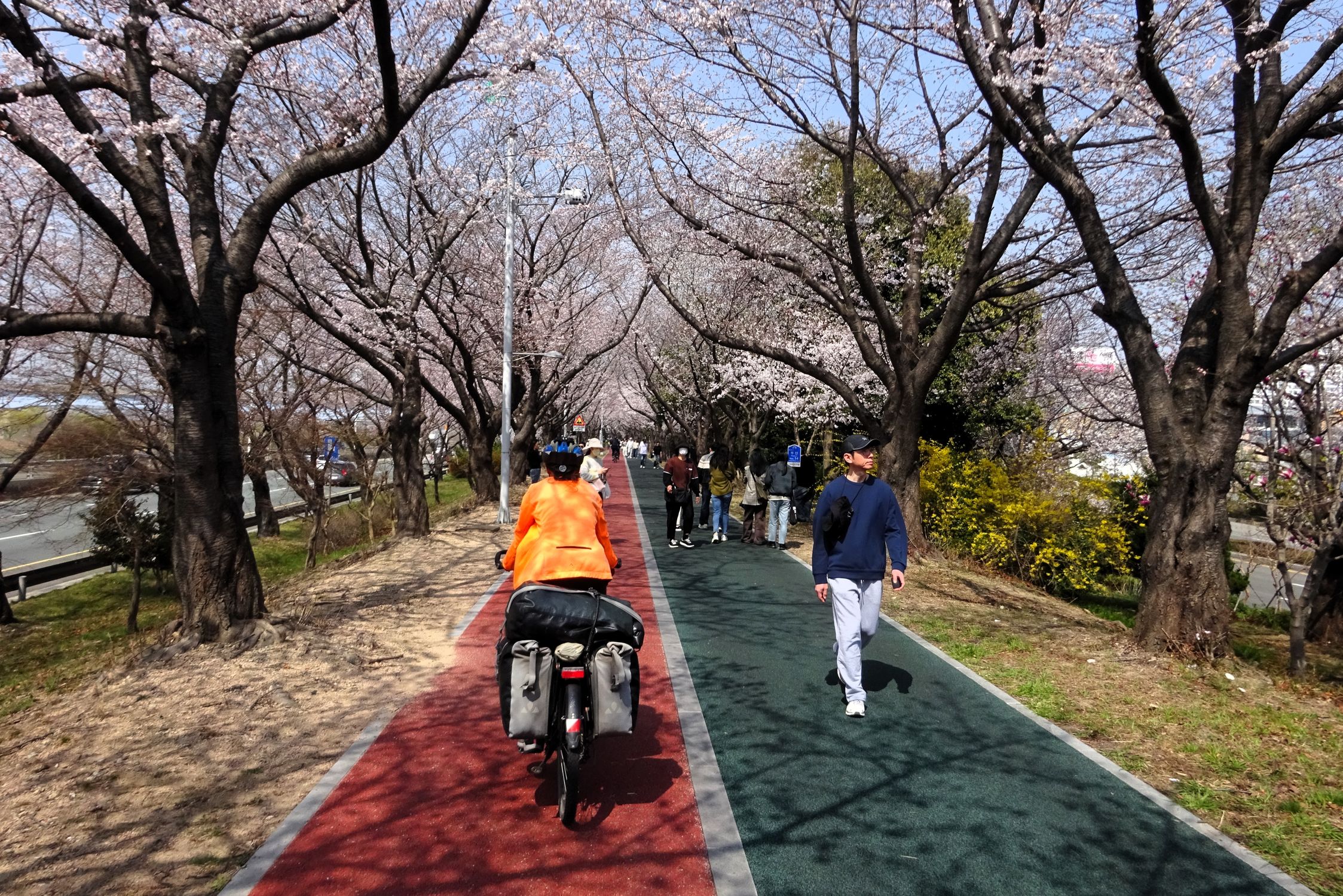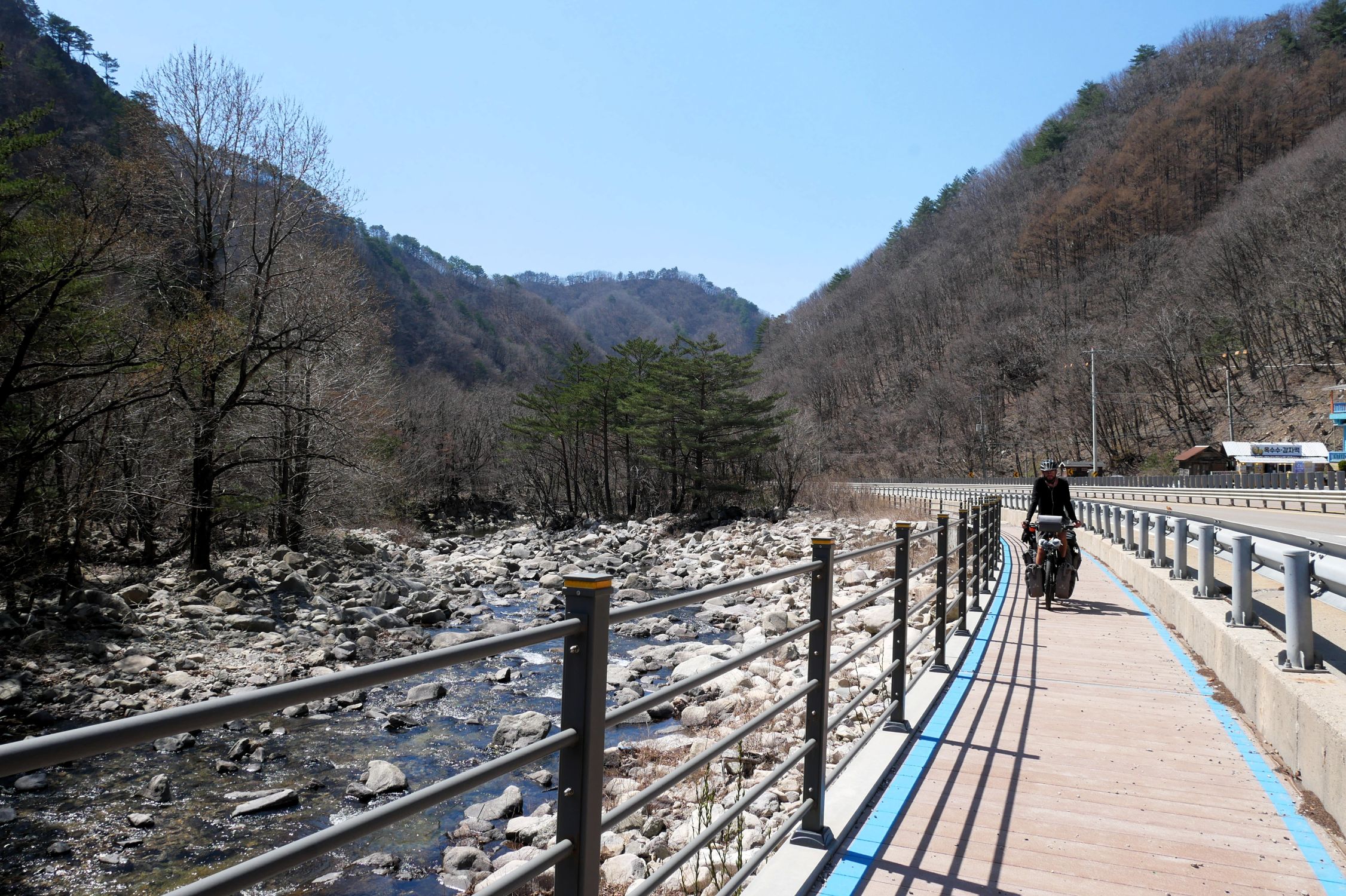 Mit der Fähre setzen wir von Japan in die Hafenstadt Busan im Südosten Südkoreas über. Damit kehren wir nach 9 Monaten wieder zurück aufs Asiatische Festland und fahren gleichzeitig nach über einem Jahr im Linksverkehr wieder auf der rechten Straßenseite. Wenn wir denn überhaupt mal auf Straßen fahren – denn Südkorea ist unter Radfahrern berühmt für sein gut ausgebautes Netz an Flussradwegen, das für ein asiatisches Land absolut einzigartig ist. Sogar weltweit einzigartig ist das Stempelsystem, in dem man spielerisch motiviert wird, auch wirklich möglichst viele der Radwege, die das Land zu bieten hat, abzufahren. Das macht Südkorea zum perfekten Transitland, denn auf den Flussradwegen lässt sich das Land ausgesprochen effizient und komfortabel durchqueren, wobei wir aber gleichzeitig am Wegesrand wenig Interessantes entdecken, was Südkorea als eigentliches Reiseziel lohnenswert machen würde. Und sobald wir das Radwegenetz mal verlassen, haben wir mit ziemlich unangenehmen Tunneln zu kämpfen, wodurch schließlich auch die Polizei auf uns aufmerksam wird. Und so sind die südkoreanischen Höhepunkte für uns zum einen die hübschen Pavillons, die absolut perfekte Zeltplätze sind, und zum anderen das ausgesprochen nette Zusammentreffen mit den Radreise-Kollegen Dai sowie Kyra & Michael.